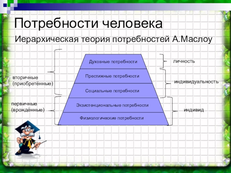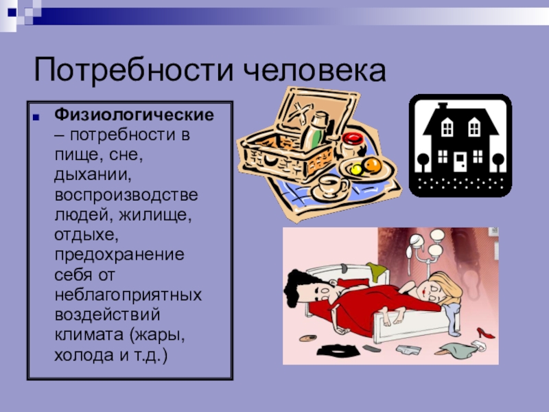 Физиологические – потребности в пище, сне, дыхании, воспроизводстве людей, жилище,