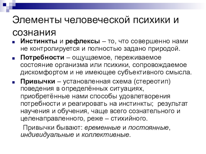 Привычки – установленная схема (стереотип) поведения в определённых ситуациях, приобретённые нами способы удовлетворения потребности и реагировать на инстинкты; результат научения и обучения, чаще всего сознательного и целенаправленного, реже – стихийного.
