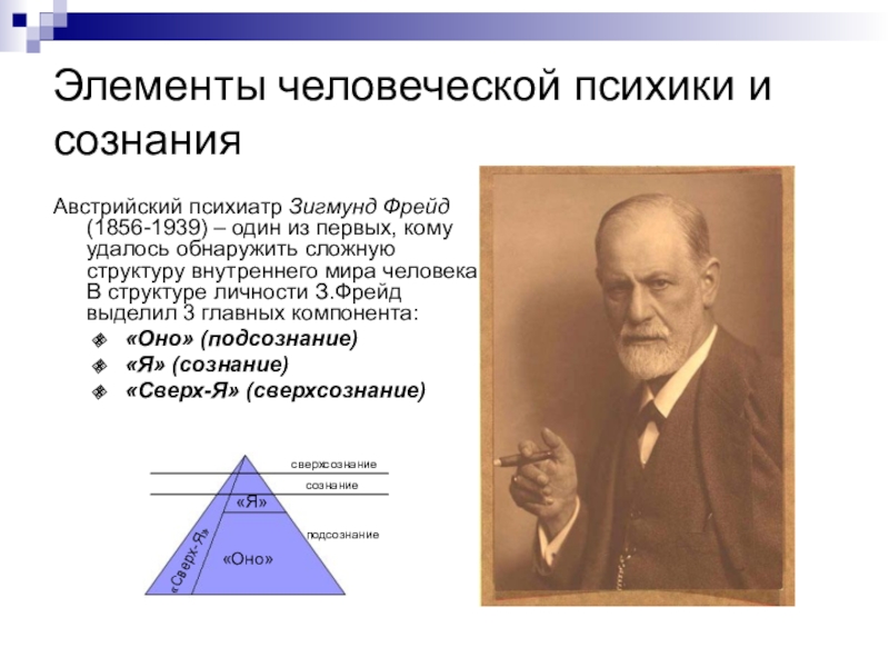 из первых, кому удалось обнаружить сложную структуру внутреннего мира человека. В структуре личности З.Фрейд выделил 3 главных компонента: