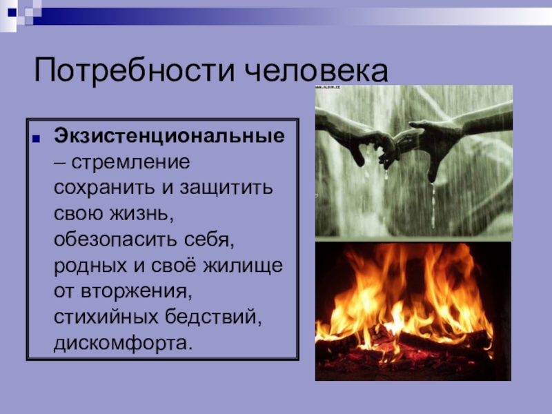 Экзистенциональные – стремление сохранить и защитить свою жизнь, обезопасить себя,