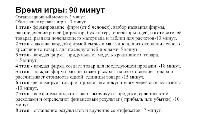 Время игры: 90 минут Организационный момент- 3 минут Объяснение правила игры - 7 минут 1 этап- формирование фирм (от 5 человек), выбор названия фирмы, распределение ролей (директор, бухгалтер, генераторы идей, изготовителей товара), раздача поясняющего материала и