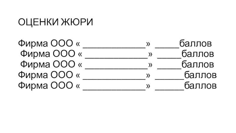 Слайд 11ОЦЕНКИ ЖЮРИ Фирма ООО « _____________» _____баллов Фирма ООО « _____________» _____баллов