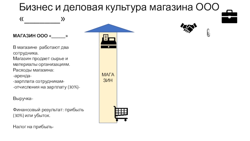 Бизнес и деловая культура магазина ООО «_______»МАГАЗИНМАГАЗИН ООО «______»В магазине работают два сотрудника. Магазин продает сырье и