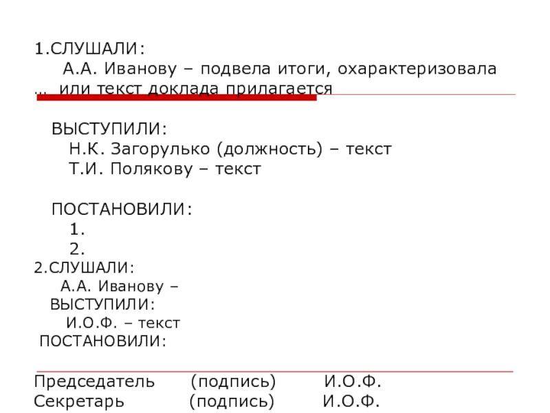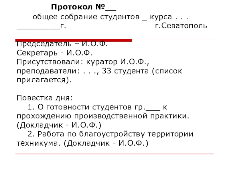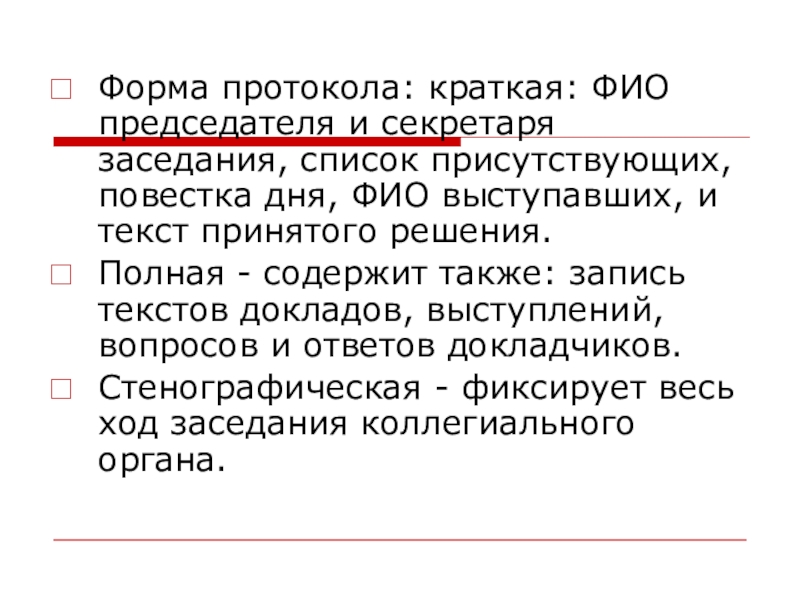 Форма протокола: краткая: ФИО председателя и секретаря заседания, список присутствующих, повестка