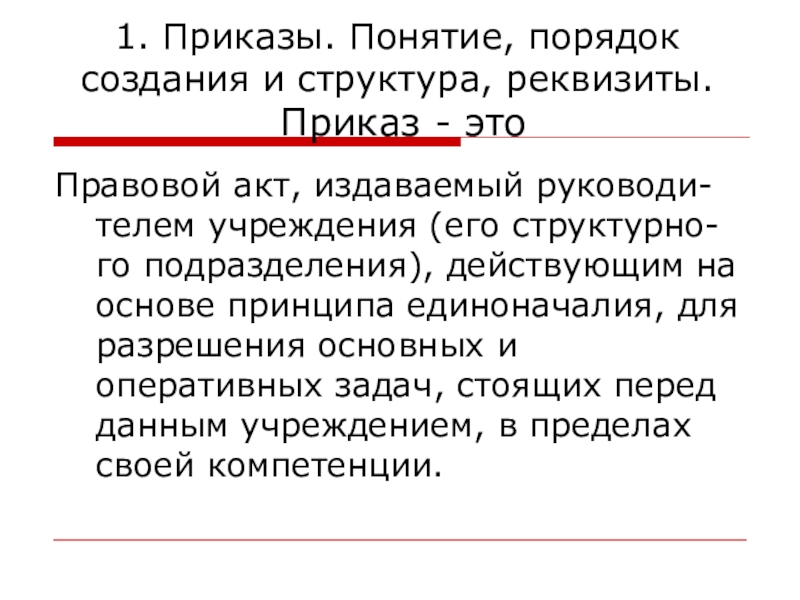 акт, издаваемый руководи- телем учреждения (его структурно-го подразделения), действующим на основе принципа единоначалия, для разрешения основных и оперативных задач, стоящих перед данным учреждением, в пределах своей компетенции.
