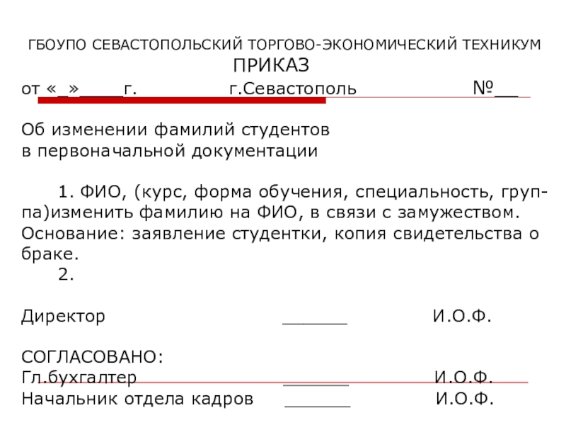 1. ФИО, (курс, форма обучения, специальность, груп-па)изменить фамилию на ФИО, в связи с замужеством.