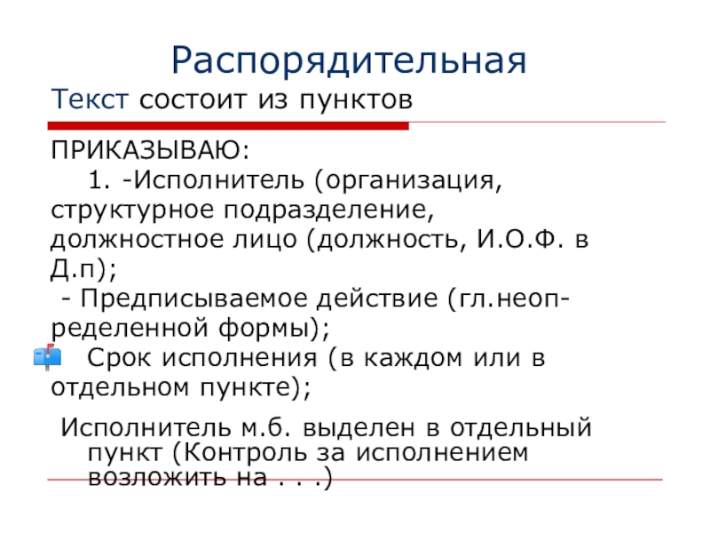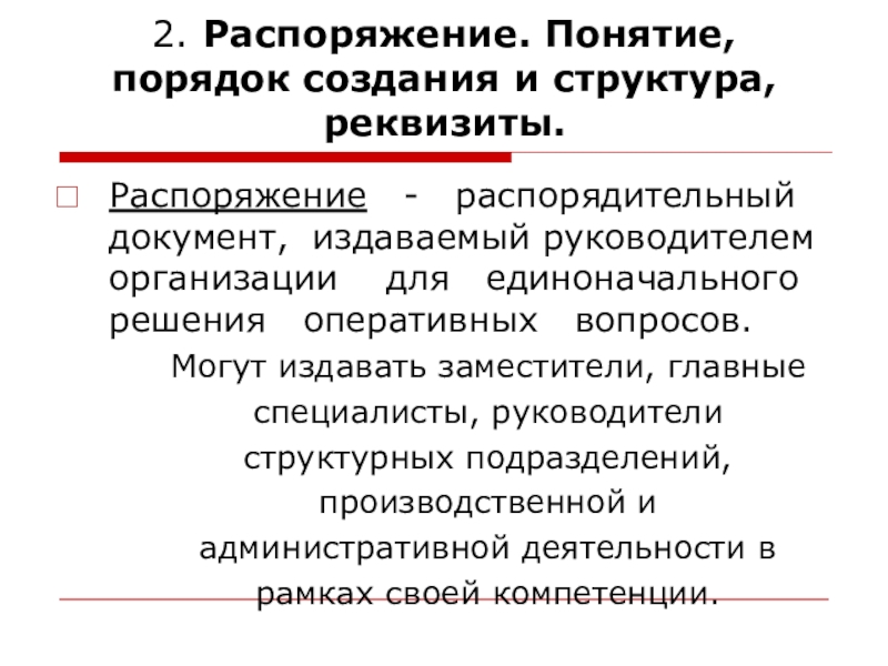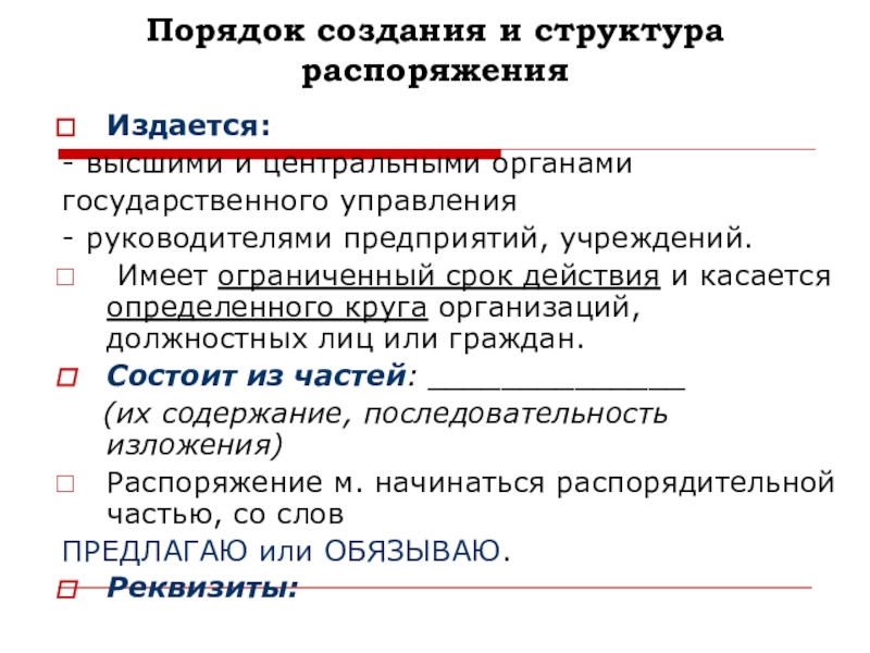 Слайд 132. Распоряжение. Понятие, порядок создания и структура, реквизиты.
