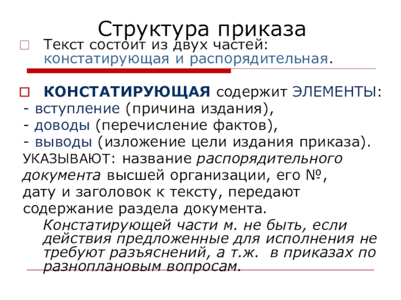 Констатирующей части м. не быть, если действия предложенные для исполнения не требуют разъяснений, а т.ж. в приказах по разноплановым вопросам.