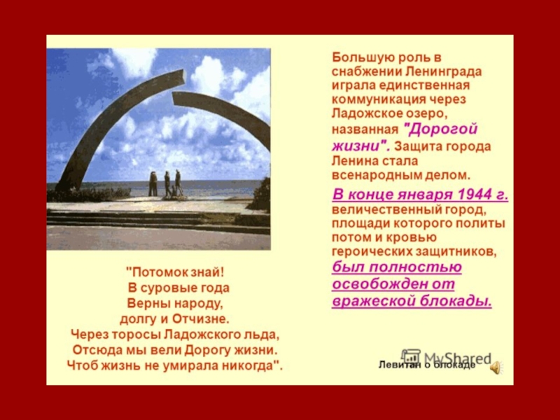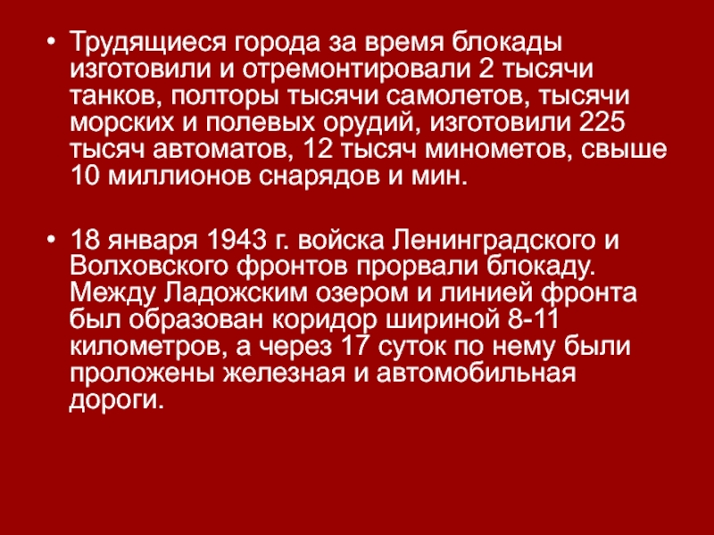 18 января 1943 г. войска Ленинградского и Волховского фронтов прорвали блокаду. Между Ладожским озером и линией фронта был образован коридор шириной 8-11 километров, а через 17 суток по нему были проложены железная и автомобильная дороги.