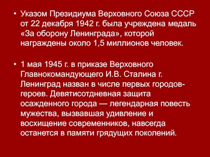 Указом Президиума Верховного Союза СССР от 22 декабря 1942 г. была учреждена медаль «За оборону Ленинграда», которой