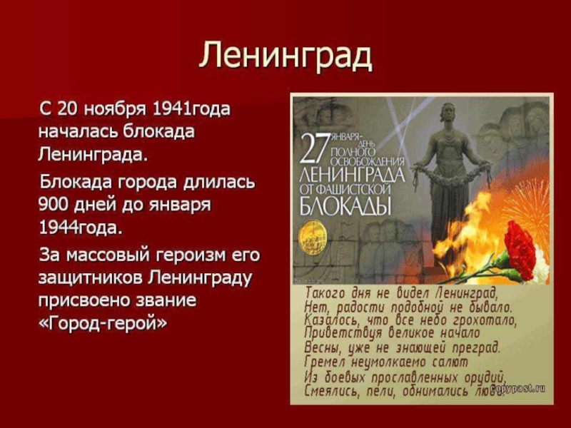 1 мая 1945 г. в приказе Верховного Главнокомандующего И.В. Сталина г. Ленинград назван в числе первых городов-героев. Девятисотдневная защита осажденного города — легендарная повесть мужества, вызвавшая удивление и восхищение современников, навсегда останется в памяти грядущих поколений.