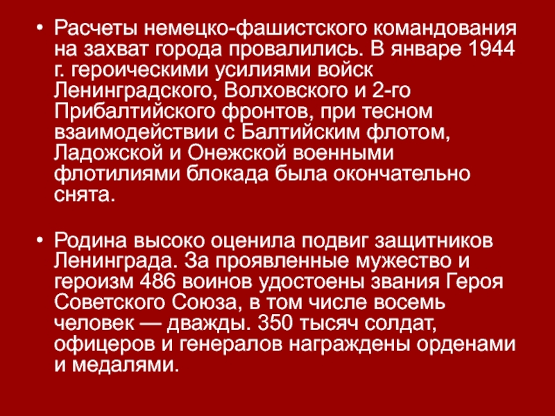Расчеты немецко-фашистского командования на захват города провалились. В январе 1944 г. героическими усилиями войск Ленинградского, Волховского и