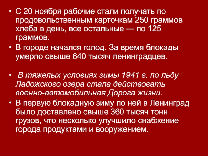 С 20 ноября рабочие стали получать по продовольственным карточкам 250 граммов хлеба в день, все остальные —