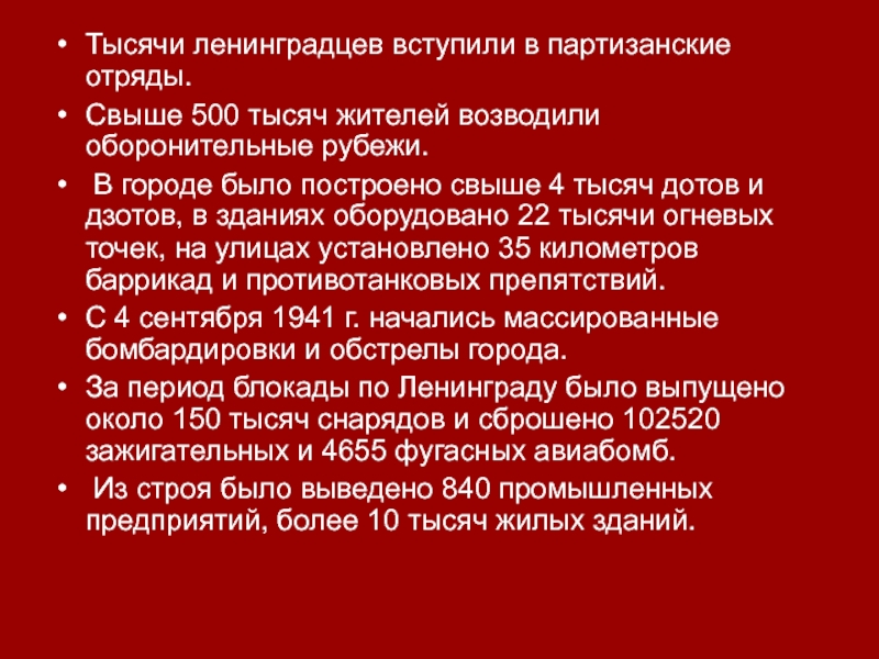 Тысячи ленинградцев вступили в партизанские отряды. Свыше 500 тысяч жителей возводили оборонительные рубежи. В городе было построено