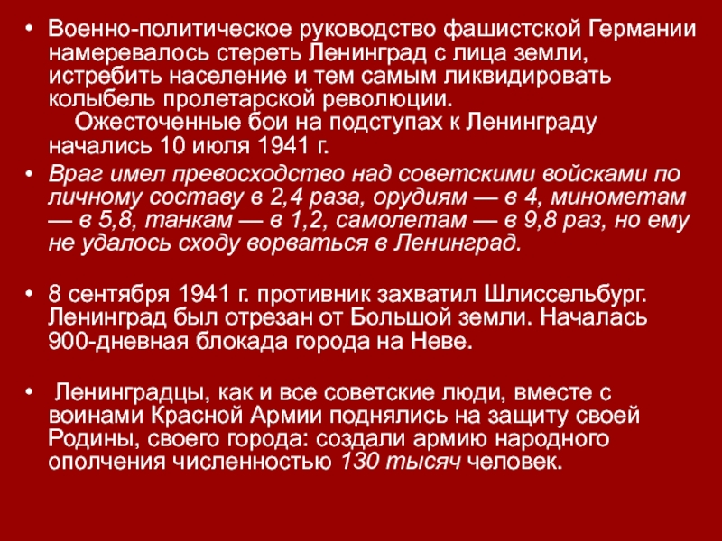 Военно-политическое руководство фашистской Германии намеревалось стереть Ленинград с лица земли, истребить население и тем самым ликвидировать колыбель пролетарской революции.     Ожесточенные бои на подступах к Ленинграду начались 10 июля 1941 г. Враг имел превосходство над советскими