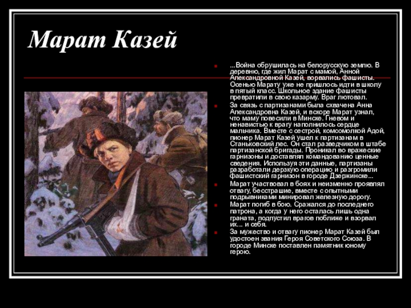 За связь с партизанами была схвачена Анна Александровна Казей, и вскоре Марат узнал, что маму повесили в Минске. Гневом и ненавистью к врагу наполнилось сердце мальчика. Вместе с сестрой, комсомолкой Адой, пионер Марат Казей ушел к партизанам в Станьковский лес. Он стал разведчиком в штабе партизанской бригады. Проникал во вражеские гарнизоны и доставлял командованию ценные сведения. Используя эти данные, партизаны разработали дерзкую операцию и разгромили фашистский гарнизон в городе Дзержинске...