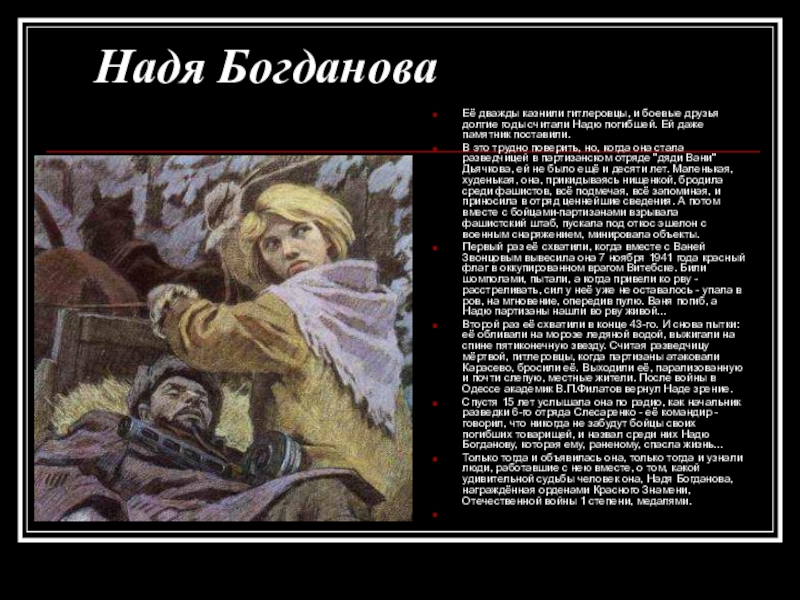 Спустя 15 лет услышала она по радио, как начальник разведки 6-го отряда Слесаренко - её командир - говорил, что никогда не забудут бойцы своих погибших товарищей, и назвал среди них Надю Богданову, которая ему, раненому, спасла жизнь...