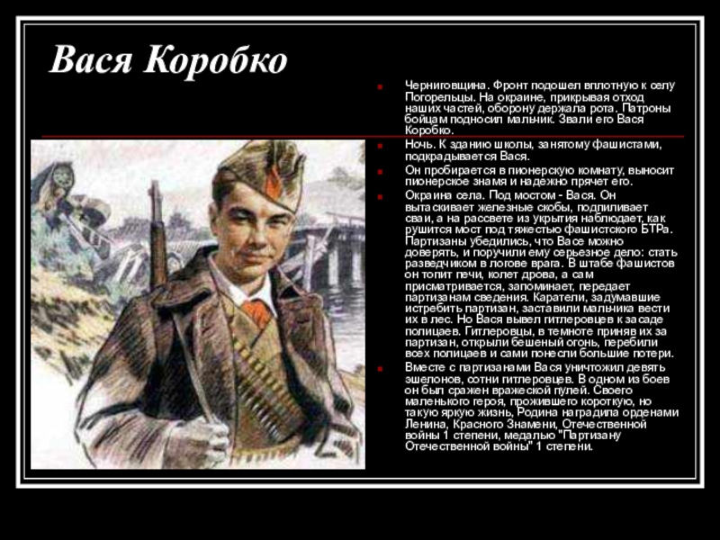 отход наших частей, оборону держала рота. Патроны бойцам подносил мальчик. Звали его Вася Коробко.