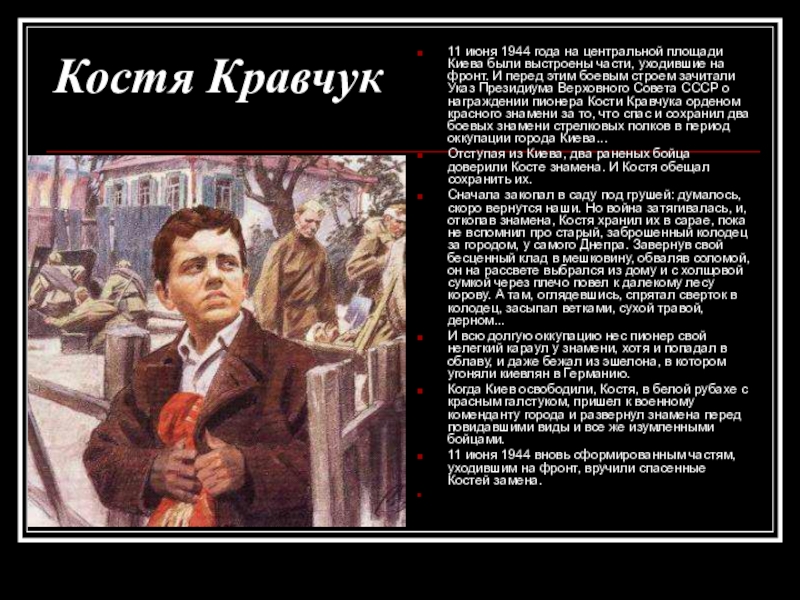 части, уходившие на фронт. И перед этим боевым строем зачитали Указ Президиума Верховного Совета СССР о награждении пионера Кости Кравчука орденом красного знамени за то, что спас и сохранил два боевых знамени стрелковых полков в период оккупации города Киева...