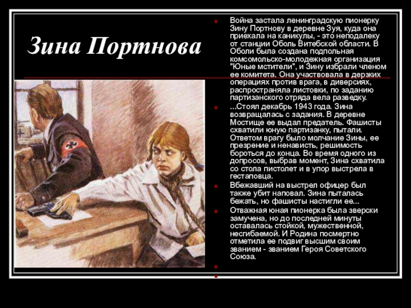 Война застала ленинградскую пионерку Зину Портнову в деревне Зуя, куда