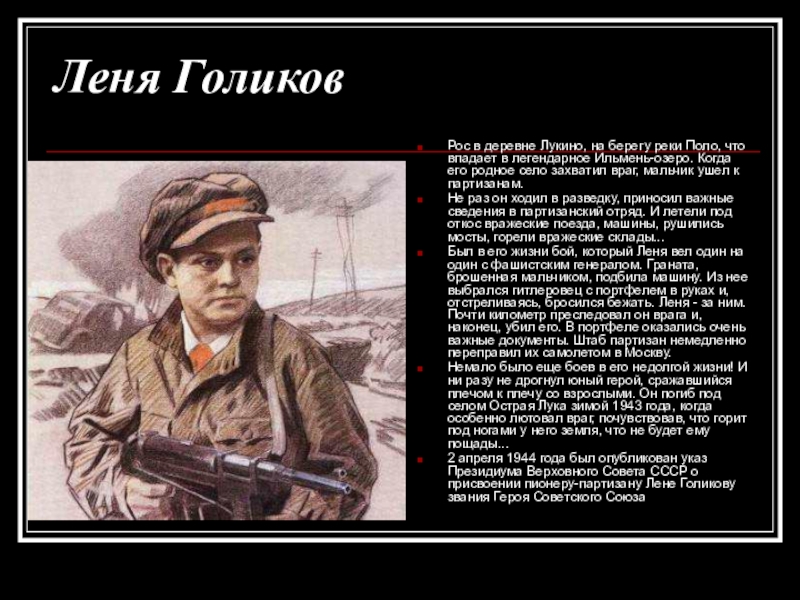 Был в его жизни бой, который Леня вел один на один с фашистским генералом. Граната, брошенная мальчиком, подбила машину. Из нее выбрался гитлеровец с портфелем в руках и, отстреливаясь, бросился бежать. Леня - за ним. Почти километр преследовал он врага и, наконец, убил его. В портфеле оказались очень важные документы. Штаб партизан немедленно переправил их самолетом в Москву.