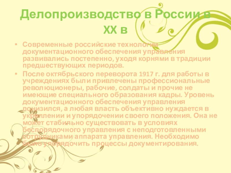 После октябрьского переворота 1917 г. для работы в учреждениях были привлечены профессиональные революционеры, рабочие, солдаты и прочие не имеющие специального образования кадры. Уровень документационного обеспечения управления понизился, а любая власть объективно нуждается в укреплении и упорядочении своего положения. Она не может стабильно существовать в условиях беспорядочного управления с неподготовленными сотрудниками аппарата управления. Необходимо было упорядочить процессы документирования.