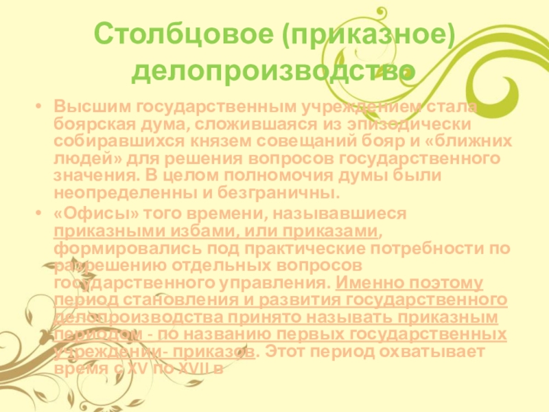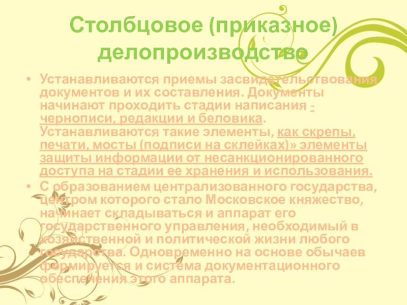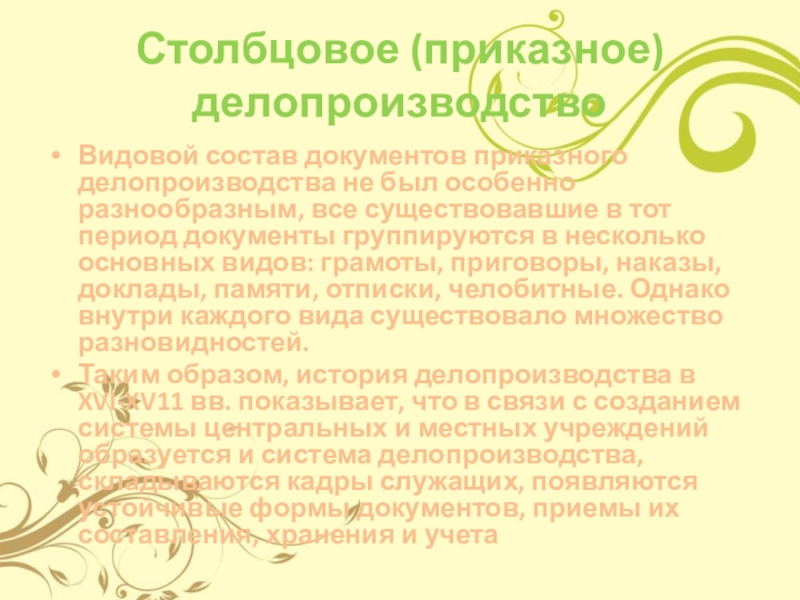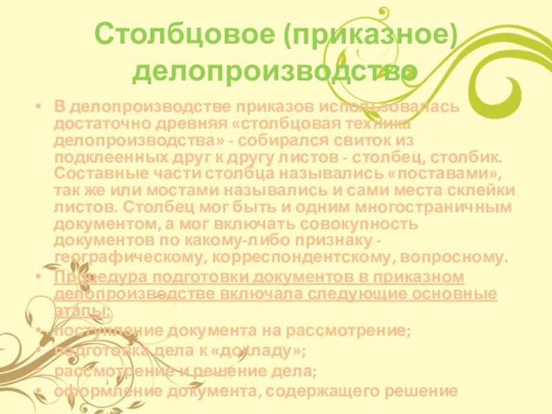 Слайд 4Столбцовое (приказное) делопроизводство