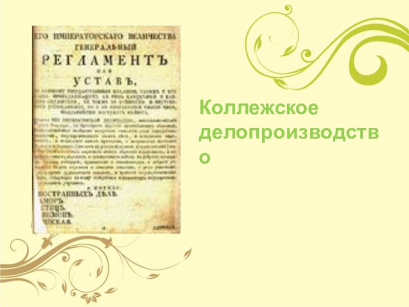 стал «Генеральный регламент», утвержденный Петром I в 1720 г. «Генеральный регламент» ввел систему делопроизводства, получившую название коллежской по названию типа учреждений. Доминирующее значение в этих учреждениях получил коллективный способ принятия решений присутствием коллегий.