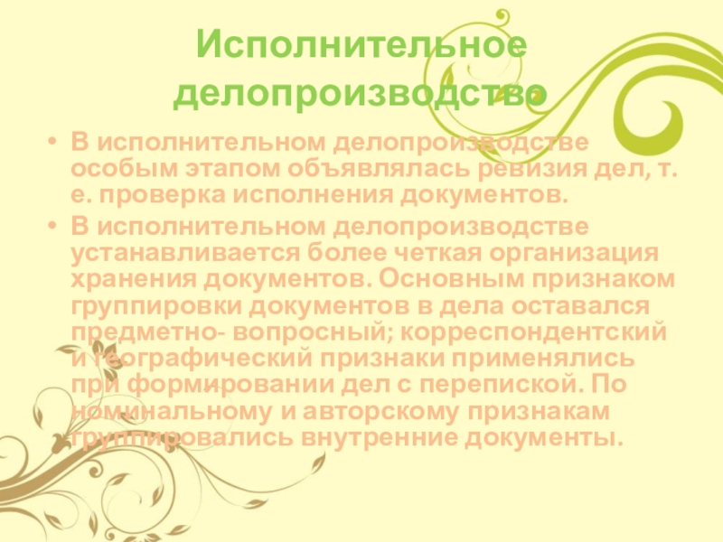 В исполнительном делопроизводстве устанавливается более четкая организация хранения документов. Основным признаком группировки документов в дела оставался предметно- вопросный; корреспондентский и географический признаки применялись при формировании дел с перепиской. По номинальному и авторскому признакам группировались внутренние документы.