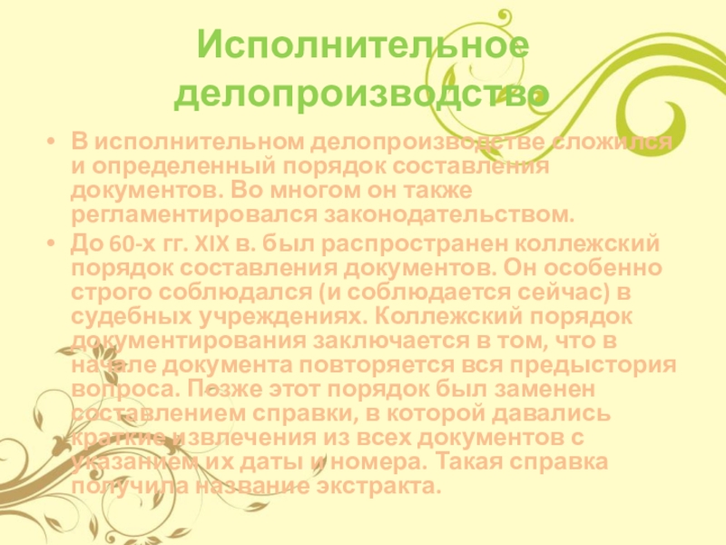 До 60-х гг. XIX в. был распространен коллежский порядок составления документов. Он особенно строго соблюдался (и соблюдается сейчас) в судебных учреждениях. Коллежский порядок документирования заключается в том, что в начале документа повторяется вся предыстория вопроса. Позже этот порядок был заменен составлением справки, в которой давались краткие извлечения из всех документов с указанием их даты и номера. Такая справка получила название экстракта.