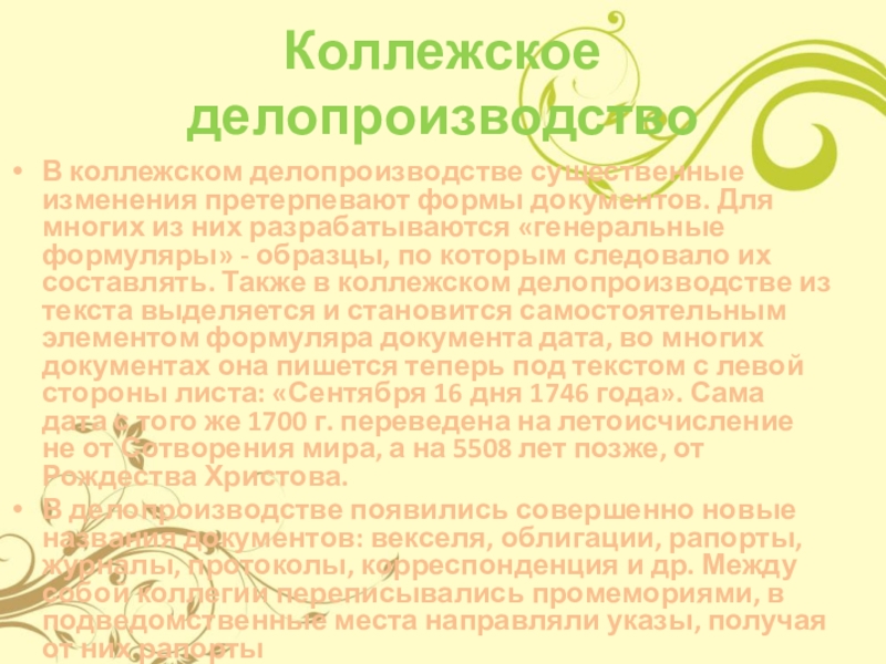 из них разрабатываются «генеральные формуляры» - образцы, по которым следовало их составлять. Также в коллежском делопроизводстве из текста выделяется и становится самостоятельным элементом формуляра документа дата, во многих документах она пишется теперь под текстом с левой стороны листа: «Сентября 16 дня 1746 года». Сама дата с того же 1700 г. переведена на летоисчисление не от Сотворения мира, а на 5508 лет позже, от Рождества Христова.