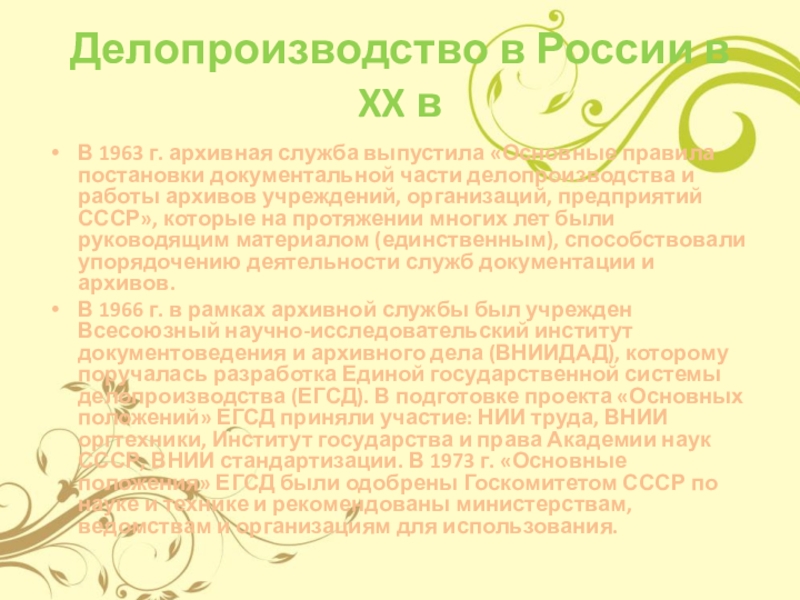 В 1966 г. в рамках архивной службы был учрежден Всесоюзный научно-исследовательский институт документоведения и архивного дела (ВНИИДАД), которому поручалась разработка Единой государственной системы делопроизводства (ЕГСД). В подготовке проекта «Основных положений» ЕГСД приняли участие: НИИ труда, ВНИИ оргтехники, Институт государства и права Академии наук СССР, ВНИИ стандартизации. В 1973 г. «Основные положения» ЕГСД были одобрены Госкомитетом СССР по науке и технике и рекомендованы министерствам, ведомствам и организациям для использования.