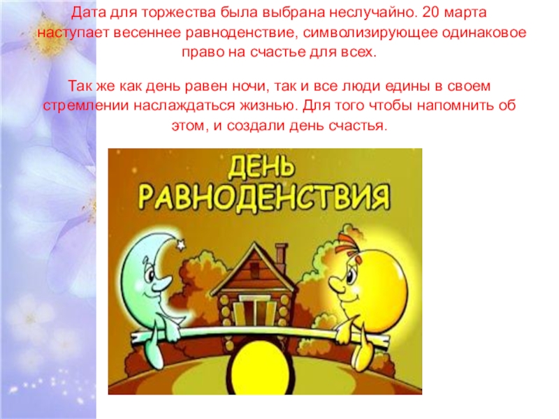 Слайд 5Дата для торжества была выбрана неслучайно. 20 марта наступает весеннее равноденствие,