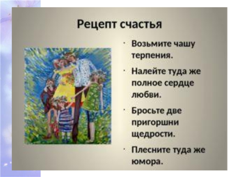 Любить своих близких и родных, учиться прощать и забывать обиды, да и самому не ранить дорогих людей. Стараться самому стать источником счастья, ведь весь мир похож на большое зеркало, отражающее наше настроение.
