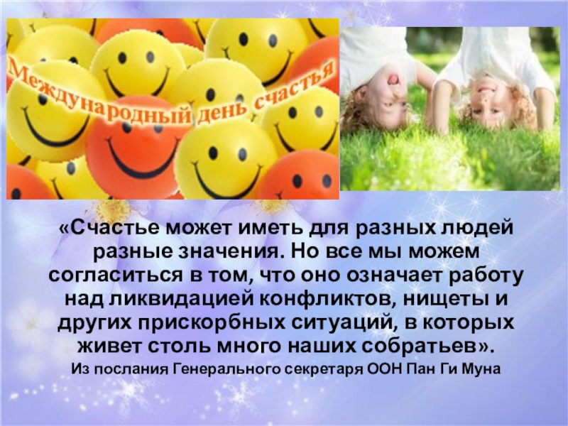 жизни людей во всем мире и важное значение их отражения в задачах государственной политики, Генеральная Ассамблея в своей резолюции от 12 июля 2012 года провозгласила 20 марта Международным днем счастья.