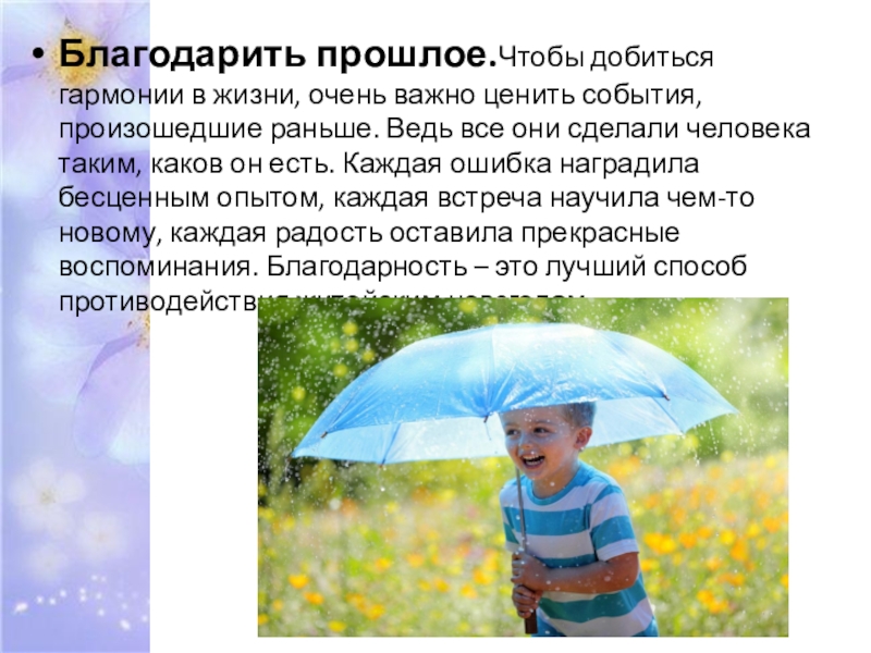 Благодарить прошлое.Чтобы добиться гармонии в жизни, очень важно ценить события, произошедшие