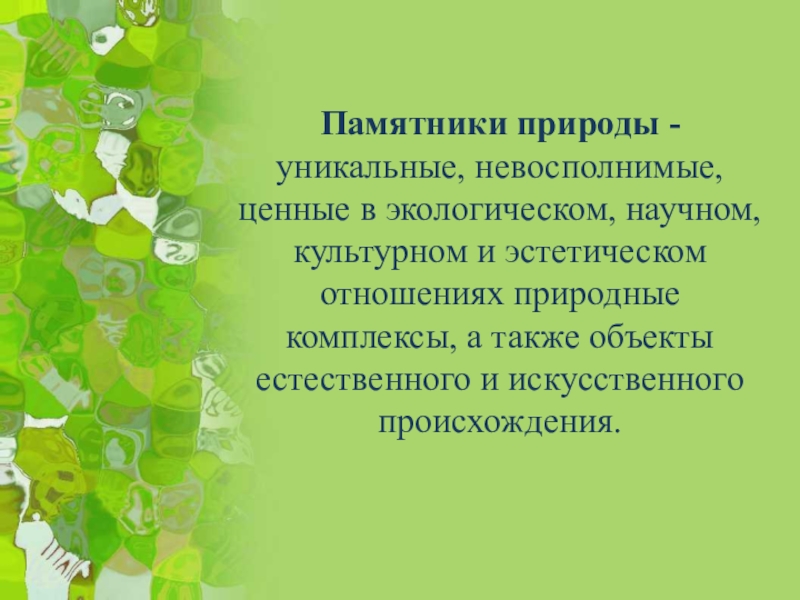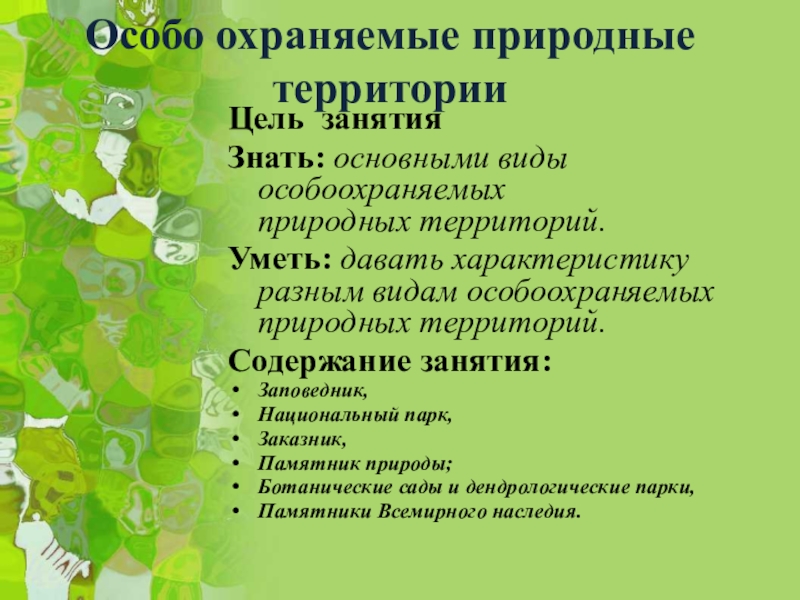 Уметь: давать характеристику разным видам особоохраняемых природных территорий.