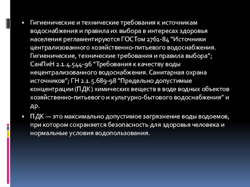 в интересах здоровья населения регламентируются ГОСТом 2761-84 “Источники централизованного хозяйственно-питьевого водоснабжения. Гигиенические, технические требования и правила выбора”; СанПиН 2.1.4.544-96 “Требования к качеству воды нецентрализованного водоснабжения. Санитарная охрана источников”; ГН 2.1.5.689-98 “Предельно допустимые концентрации (ПДК) химических веществ в воде водных объектов хозяйственно-питьевого и культурно-бытового водоснабжения” и др.