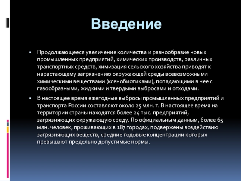 транспортных средств, химизация сельского хозяйства приводят к нарастающему загрязнению окружающей среды всевозможными химическими веществами (ксенобиотиками), попадающими в нее с газообразными, жидкими и твердыми выбросами и отходами.