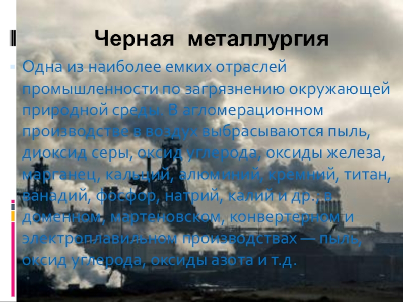 среды. В агломерационном производстве в воздух выбрасываются пыль, диоксид серы, оксид углерода, оксиды железа, марганец, кальций, алюминий, кремний, титан, ванадий, фосфор, натрий, калий и др.; в доменном, мартеновском, конвертерном и электроплавильном производствах — пыль, оксид углерода, оксиды азота и т.д.