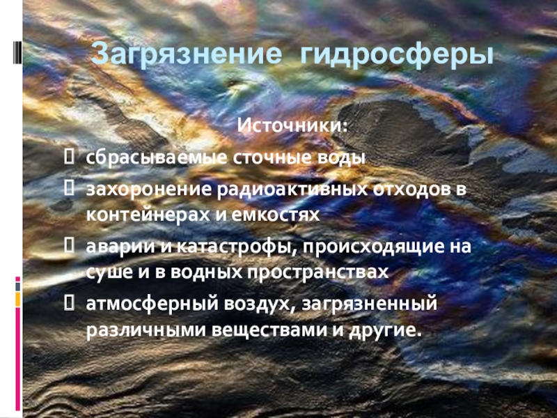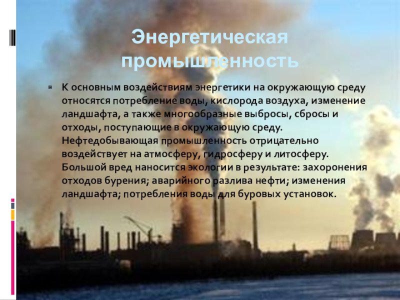 кислорода воздуха, изменение ландшафта, а также многообразные выбросы, сбросы и отходы, поступающие в окружающую среду. Нефтедобывающая промышленность отрицательно воздействует на атмосферу, гидросферу и литосферу. Большой вред наносится экологии в результате: захоронения отходов бурения; аварийного разлива нефти; изменения ландшафта; потребления воды для буровых установок.