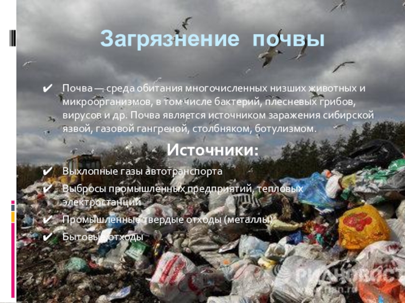 том числе бактерий, плесневых грибов, вирусов и др. Почва является источником заражения сибирской язвой, газовой гангреной, столбняком, ботулизмом.
