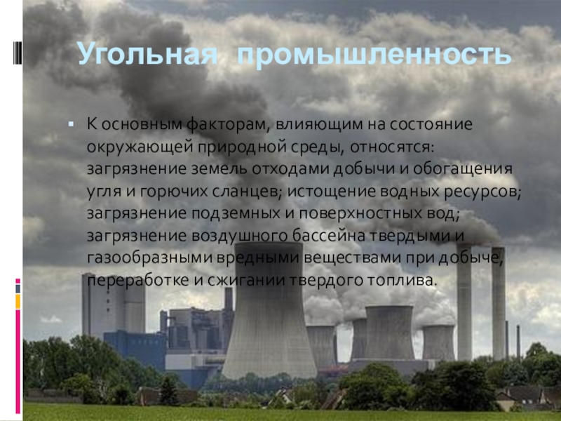 загрязнение земель отходами добычи и обогащения угля и горючих сланцев; истощение водных ресурсов; загрязнение подземных и поверхностных вод; загрязнение воздушного бассейна твердыми и газообразными вредными веществами при добыче, переработке и сжигании твердого топлива.