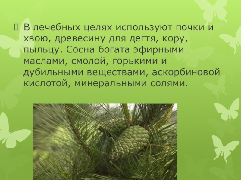 пыльцу. Сосна богата эфирными маслами, смолой, горькими и дубильными веществами, аскорбиновой кислотой, минеральными солями.