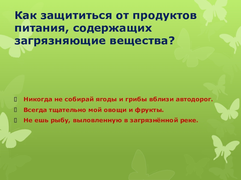 Слайд 9Как защититься от продуктов питания, содержащих загрязняющие вещества?