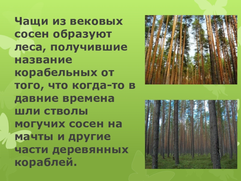 Слайд 30Чащи из вековых сосен образуют леса, получившие название корабельных от того,