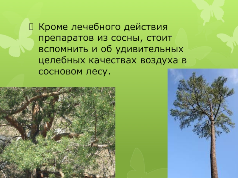 Слайд 33Кроме лечебного действия препаратов из сосны, стоит вспомнить и об удивительных