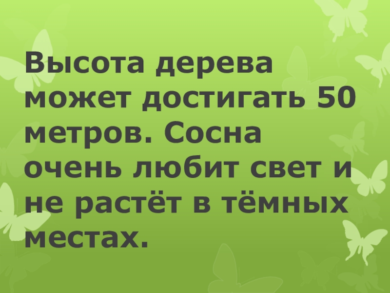 Слайд 28Высота дерева может достигать 50 метров. Сосна очень любит свет и