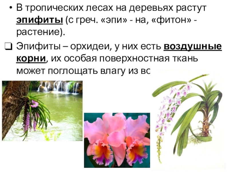 Слайд 7В тропических лесах на деревьях растут эпифиты (с греч. «эпи» -