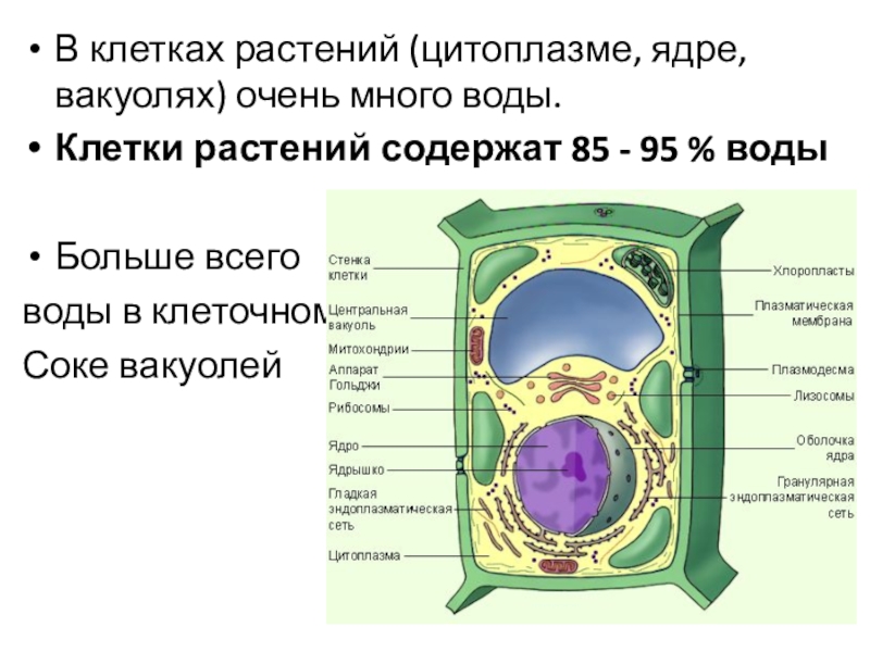 Слайд 3В клетках растений (цитоплазме, ядре, вакуолях) очень много воды.